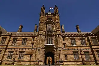 • The Clock Tower, a classic example of Neogothic design, sits at the end of the long walkway from Victoria Park. On the other side of the building is the Main Quadrangle, which has a single jacaranda tree in the courtyard that can be caught in full purple bloom during late spring.