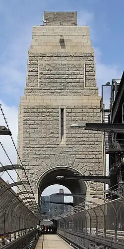 - Southeast Bridge Pylon, β +61 2 9240 1100. The pylon is open 10AM-5PM every day except Christmas Day. Climb up to the Pylon Lookout. Entrance is from the pedestrian walkway on Bradfield Highway approach to the bridge. (There is no entrance at the base of the Pylon in Dawes Point.) As you climb the 200 steps within the pylon, you pass 3 levels of exhibits describing pictorially the history of the bridge. The view at the Pylon Lookout is as good as from the Sydney tower, maybe better, as you are out in the open air and next to the harbour. It may be the cheapest way to take aerial photos of the harbour, including the Opera House. (You cannot take a camera with you on the bridge climb.) Admission is $13 adults, $6.50 children under 13, and free for children under 7.