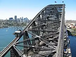 - π Bridge Climb, β +61 2 8274 7777, fax: +61 2 9240 1122, admin@bridgeclimb.com. You can climb to the top of the arch of the bridge. For those who are good with heights and enjoy a spectacular view of the harbour, there are organised climbs to the top of the bridge. This climb is more demanding than climbing a set of stairs, although it is not so demanding as the name implies. You will be fitted with special climbing suits and secured by safety tethers, you must be 10 years old or over to take the climb. The climb takes 3Β½ hours and a group leaves every 10 minutes. You can ascend during the day, at twilight and at night. Book your climb as early as possible as the climb is very popular. Loose items including cameras are prohibited on the climb; Bridge Climb staff will take a photo of you, but you may not take photographs yourself. Standard rates are around $360 adults and $160 children, with extra cost for special times.
