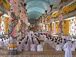 - Cao Dai Temple. Services at 06:00, 12:00, 18:00, 24:00. Most tourists arrive for the noon mass. There is a balcony that runs along the walls halfway up. This is where you can watch the service. It is a very nice view. There is an orchestra of approximately 10 musicians whose music is traditionally Vietnamese. A choir of approximately 20 lead the congregation in the prayers. The musical mix of the hymns is very unusual with a blend of Western and Vietnamese. In the front of the temple is the Divine Eye in the shape of a triangle of justice. It is surrounded by flowers on a cosmic globe. On the altar sit 3 glasses of wine, a cup of water and a cup of tea. The temple's domed ceiling is painted with stars and has a blue globe which is a Cao Dai icon. Free.