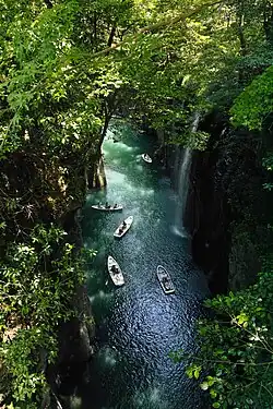 - 🌍 Takachiho Gorge (高千穂峡). Carved by the Gokase River, one of the main highlights is the 17-m Minai Waterfall, best viewed by the sightseeing railway above or renting a boat (¥5,000/30 min for up to 3 people) and going for a paddle, since the current is gentle and easy to navigate. But there is also a 300-m hiking path beside the river, which passes several striking rock formations, and terminates at a small rest area, parking lot, and bridge across the rapids in the narrowest part of the Gokase River.