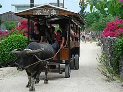 The touristy way to see Taketomi is from cart pulled by a water buffalo (水牛車 suigyūsha), complete with guide telling folk stories (in Japanese) and twanging on a sanshin while at it. This is purely for sightseeing, not a practical means of transport, as the only option is a 30-minute round-trip tour for ¥1200/600 adult/child, including port transfers. While the scene is picturesque enough, animal lovers may have second thoughts, as the water buffaloes themselves aren't terribly pleased about having to lug around heavy carts in the midday heat and small whips are used rather liberally as encouragement.