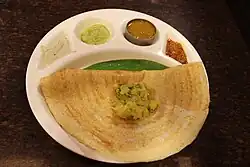 • Dosai or dosa - This is India's answer to the French crepes, though the answer could arguably have been given much before the question was asked. It is made from rice and black gram flour. Dosas again come in a variety of forms and sizes. A dosa with potato curry stuffed inside becomes a masala dosa. A dosa made from rice flour and fine semolina (rava) becomes a rava dosa. Like idlis, dosas are usually eaten with coconut chutney, tomato chutney, pudina chutney and sambar.