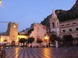 - 🌍 Piazza IX Aprile. A square with a balcony facing the Mediterranean Sea and Mount Etna. In the corner of the square stands the Torre dell'Orologio.