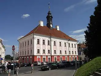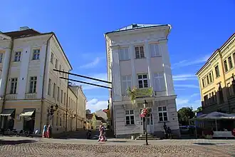 - 🌍 Barclay House, Raekoja 18. Late 18th century building. Duchess Barclay bought the house in 1819 after the death of her husband, Barclay de Tolly. The riverside wall of the building is actually a reused part of the old town wall, while the other side was built on a new foundation. This is why the house is now askew and is popularly called the Tower of Pisa.