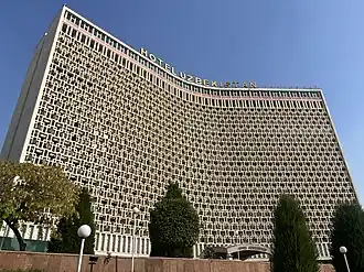 - 🌍 Uzbekistan Hotel, Mirzamakhmud Musakhanov 45 (Metro Amir Temur Xiyoboni or Yunus Rajabiy), ☏ +998 78 113 1111. Great Soviet slab, a piece of city history, slowly getting a makeover. Very central, mostly good reviews, though the aircon struggles on hot days. Their website is only in Uzbek and Russian, and they don't respond to enquiries in English. B&B double US$65.