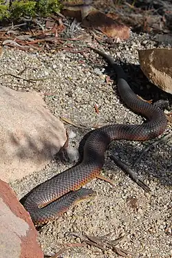There are three species of snake in Tasmania: copperhead, white-lipped, and tiger. The tiger snake is one of the most venomous snakes in the world, but don't let that deter you. No one has died from a snake bite in Tasmania since 1977. All three use the same anti-venom so identification of the snake is not important. Most snakes will slither away as soon as they hear you coming.