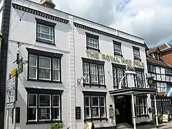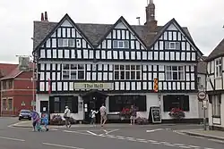 - π The Royal Hop Pole, 94 Church Street, GL20 5RS, β +44 1684 278670. The local JD Wetherspoons pub, serving food and drink. The building, like much of Tewkesbury, is medieval and timber-framed with an array of beams holding it together. The pub was also mentioned in Charles Dickens' first novel The Pickwick Papers.