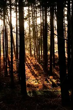 When first planted, the Scots pine was the main species grown. However gradually the Corsican pine has been planted instead due to its increased resistance to fungal attack and insect pests. A variety of other species have been planted but have been less commercially successful. Hardwood trees are used in belts beside roads in part to act as fire breaks; these include oak, beech, lime, walnut, red oak, and maple.