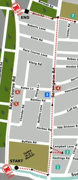 The first road to your left is Serangoon Road, the central artery of Little India. Across the road is Tekka Mall/The Verge (1), Little India's first and only air-con mall, but of more interest is the low-rise building to the left, which houses the Little India Arcade (2). This is a collection of small shops and stalls that sell all sorts of Indian items, some geared for tourists, but most are for the locals. Note the flower garlands, for decorating home shrines, and the little leaf packets with something red and white inside: this is paan, a mildly narcotic concoction of betel nut and lime. Go ahead and try some, but the taste is bitter, it stains your teeth red and you need to keep chewing for 20 minutes to get any buzz.