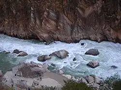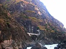 🌍 Further down to the Gorge to Walnut Grove. From Tina's GH or Zhang GH, you can go down the middle gorge (each path cost ¥15, no combined ticket if you want to use both). Viewpoint from Zhang's GH has entrance fee of ¥2/5, which seems to be enforced only reluctantly. Once down in the gorge, turning left at the last hut before the Tiger Leaping Rock, you can continue downstream to Walnut Grove (path fee ¥15), along the river through an impressive cut along the sheer cliff. ![]()