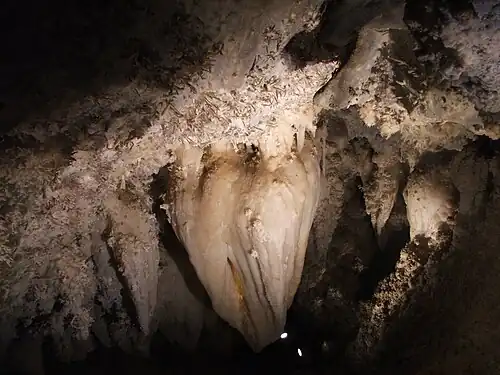 There are many doors in the man-made connecting tunnels of the cave which many visitors may mistake as protection against vandals. While these doors may have the added benefit of stopping determined cave invaders, they were built to serve another purpose. Cave formations are created due to the action of dripping water, and when the man-made tunnels that connect the three cave sections were built they allowed air to flow through the caves, causing the humid interior to dry out and essentially stopping any further growth of the formations that make the cave famous. To fix this problem the park service built doors throughout the cave that, while not airtight, greatly reduce airflow and allow the cave's natural processes to continue. |