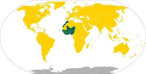 The currency of the country is the West African CFA franc, denoted CFA (ISO currency code: XOF). It's also used by seven other West African countries. It is interchangeable at par with the Central African CFA franc (XAF), which is used by six countries. Both currencies are fixed at a rate of 1 euro = 655.957 CFA francs.