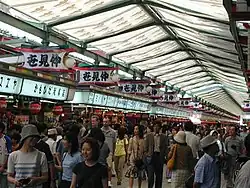 - 🌍 Nakamise (仲見世). This busy covered shopping arcade leads from the Kaminarimon gate to the temple, selling all sorts of Buddhist paraphernalia as well as assorted tourist kitsch. This is one of the best places in Tokyo to buy souvenirs (the other being the Oriental Bazaar in Omotesando), but more expensive items such as swords and kimono are likely to be of inferior quality. Slightly nicer crafts, rather than mass-produced kitsch, can be found at good prices if you walk up to the temple, turn right, and turn right again on the first small street running parallel to Nakamise. You will see plenty of small shops in this general area which have better quality souvenirs and gifts, like handkerchiefs, strings of hand-made silk balls, and hairclips.
