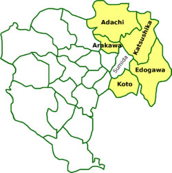 Eastern Tokyo covers the wards of Adachi (足立), Katsushika (葛飾), Edogawa (江戸川), Kōtō (江東) and Arakawa (荒川). Neighboring Sumida (墨田) is covered in its own article, as is the flashy bayside shopping and entertainment district of Odaiba.