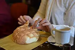 Melon-pan (メロンパン meronpan), a fluffy sweet bun with a thick, cookie-like cross-hatched crust, was invented at the nearby Imperial Hotel and is now considered a Ginza icon, with Hotel Okura and Hotel Seiyou famous for their versions. The name comes from the appearance, and the original recipe had no melon at all, but it's often melon-flavored these days and shops like Kimuraya sell melon-pan in special flavors such as coffee or orange.
