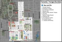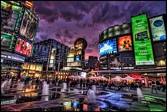 Yonge-Dundas is the very heart of downtown Torontoβin more ways than one. After all, the major arterials of Yonge Street and Dundas St meet here, and the resulting intersection may be the city's busiest (at least for pedestrians). Virtually every visitor to Toronto passes through here at some point.