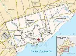 - π Old City Hall (York County Court House), 60 Queen Street West (1 block west of Yonge St). This landmark, built in the Romanesque Revival style and completed in 1899, has a distinctive clock tower which can seen along Bay St from Front Street. The architect was E. J. Lennox who also designed Casa Loma. Old City Hall was home to Toronto's city council from 1899 to 1966. The building is a National Historic Site of Canada, and will continue to serve as the York County Court House until 2021 when it will be converted to a new purpose.