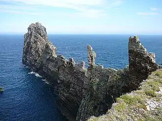 Tory Island (Oileán Toraigh) is an island 11 km off the northwest coast of County Donegal, with a population of 119 in 2016: the community are Irish-speaking. It has scrappy remains of a monastery, but the main attraction is the remote scenery, with sea-cliffs swirling with birds.