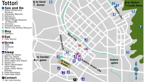- 🌍 Tottori Sightseeing Association (鳥取市観光コンベンション協会), 160 Suehiroonsencho, ☏ +81 857-26-0756. M-F 09:00-17:00.