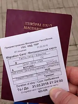 Entering Transnistria/Pridnestrovie is fairly straightforward by bus, train or car from the west (Moldova, usually Chișinău). Upon entering Transnistria, you present your passport and they'll enter your info on their computer and print out a card in Russian and English. Upon clearing immigration, this card, not your passport, is stamped – half the card stays at the crossing you entered, and half stays with you until you leave Transnistria. As of October 2018, this card was not stamped or checked during the entire visit.