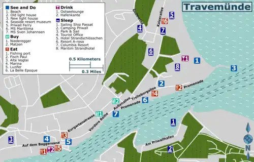 - 🌍 Travemünde tourist office, Bertlingstraße 21 (Strandbahnhof), ☏ +49 451 889-9700. 1 Nov-Easter M-F 09:30-17:30; Easter-31 May & 1-31 Oct M-F 09:30-17:30, Sa 10:00-15:00, Su & holidays 11:00-14:00; 1 Jun-30 Sep M-F 09:30-17:30, Sa,Su 10:00-17:00. Lübeck and Travemünde have a joint tourist office but they run a separate website for Travemünde. Their office in Travemünde is inside the historic railway station, which is very convenient for day trippers, although quite far away from the port.