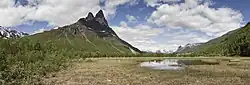 Except for the inner areas along the border, Troms is characterised by a fragmented landscape with several big islands, the largest of which are Hinnøya and Senja. Harstad city is on Hinnøy while central Tromsø sits on a smaller island in a fjord. The landscape is generally mountainous with several alpine areas such as on Senja and in Lyngen. Unlike the narrow valleys of Western Norway, the inner valleys of Troms are often generously wide with slow meandering rivers. There are several great fjords cutting deep into the land, almost to the border at some points.