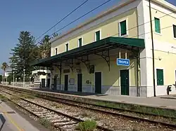 Tropea's train station lies at the top of the town, about 350 m from the historic centre. Trenitalia provides service on this line between Lamezia Terme and Rosarno. The travel time from Lamezia Terme is roughly one hour.