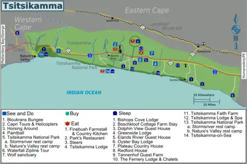 - Tsitsikamma-on-Sea, ☏ +27 42 2803-697, fax: +27 42 2809-903, admin.tos@telkomsa.net. This private estate drapes over three kilometers of rugged coastline. Elegantly appointed suites, with spectacular ocean views from Cape St. Francis in the east to Plettenberg Bay in the west. Private balconies allow for intimate and romantic dining. Traditional South African breakfast buffets, light lunches and gourmet dinners. Private wine cellar stocked with rare South African award winning vintage wines. From R1,800 per suite.