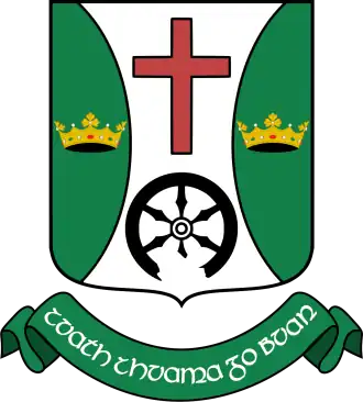 - 🌍 Teampall Jarlath on High St is a fenced-off ruined 13th century church. Here the town story begins and the journey of St Jarlath (Iarlaithe mac Loga) ended. He lived in Connacht circa 450-540 AD and may be the same Iarlaithe who was Bishop of Armagh, though that fellow died in 481 AD. One of his students, St Brendan of Clonfert, told him (circa 520) to set off in a new chariot, and wherever it broke would be the place of his resurrection. This sounds like telling a senior member of the Faculty that he's actually been dead this last 40 years and even the undergraduates are beginning to notice - high time he retired. And if the chariot was sold as new, it was a dud, because Jarlath got all of 3 km from Cloonfush to Tuam before the wheel shaft broke. So here he founded a monastery, and the town grew up around it, taking a broken chariot wheel as its symbol. The church on this spot is similarly broken.