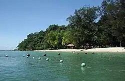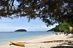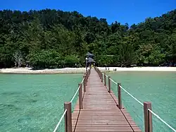 - π Manukan. One of the most developed islands in the Tunku Abdul Rahman Marine Park due to its 1-km stretch of white sandy beach and pine-tree lined shores. Sutera Sanctuary Lodges have expensive beach and hill-side chalets here for rent, as well as a covered restaurant and a daily beach BBQ buffet spread. Other facilities include a snorkelling equipment rental hut, a small sundry shop, changing rooms. toilets and Scubadoo underwater scooters. Life guards are on duty on the main beach where there are also wooden tables and chairs for picnics. During the holiday season the island can get quite crowded, but makes for interesting people watching. Shallow water corals have all but been destroyed by stampeding holiday makers, but in deeper water and near the jetty area there are still vibrant fish life to be found. For those interested in hiking, there is a 1.5-km "jungle trek" paved walking path which starts from the base of the dock, and leads hikers through the forest to the opposite end of the island. From the end, you can either turn back or clamber down an unmarked path to the beach below. It is possible to walk along the south side of the island all the way back to the dock and the main beach if you don't mind climbing over a lot of rocks (accessibility may depend on the tides; use your best judgment).