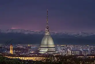 - 🌍 Mole Antonelliana (National Cinema Museum), Via Montebello 20, ☏ +39 011 813 8563. W-F, Su M 09:00-19:00, Sa 09:00-22:00. The Mole, Turin's landmark building built in 1888, was intended as a synagogue but the size and cost got out of hand and the Jewish community never used it. The 167.5-metre tower is the highest work of masonry in Europe and you can ride a lift to the cupola at the top. Within it, the National Cinema Museum is a vast exhibition space spiralling up five floors. The themes of the floors are the archaeology of cinema, the video camera, a collection of cinema posters, video installations (with side rooms screening clips), and the Great Temple where you recline in comfy red chairs and watch — or is it worship? — Italian film classics projected on giant screens overhead. Artefacts include magic lanterns, optical illusions, photographs, drawings, models, props and costumes, such as the original cape worn by Christopher Reeve in Superman in 1978. Museum €12, lift €9.