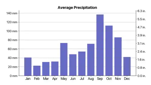 The rainy season commences in June and extends until late November, and is characterized by higher temperatures and higher humidity, as well as frequent, intense rainfall. Temperatures range from 79°F to 84°F (26°C to 29°C), with occasional high reaching up to 95°F (35°C). September is the peak of the rainy season, with an average precipitation of 5.35 inches (136 mm). It is also the least favored month for visiting.