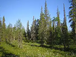 The trail leads through taiga: mostly coniferous forest, with lakes, some deciduous woods, bogs and hills. In Lapland you will also have fell birch forest, larger mires and open fell landscapes. There shouldn't be any real fords, unless you hike off season.