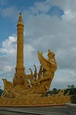 - Thung Si Muang Park (ทุ่งศรีเมือง). At the centre of town in front of city hall, this pleasant little park has several points of interest. A bright yellow elaborately carved candle sculpture, completed in 2000, standing 22 m tall and dedicated to the king, showcases Isaan art styles and has become the symbol of the city. The candle is placed on a junk, with a garuda eagle at the bow and a naga serpent around it. A statue of Phra Phatumvoraratsuriyawang commemorates the tersely-named founder of the town. Monument of Goodness (อนุสาวรีย์แห่งความดี), built by WWII POWs to honour the generosity and goodness of the people of Ubon Ratchathani.