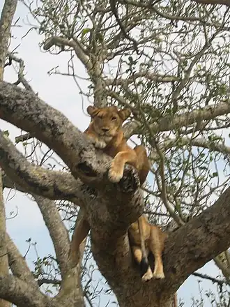 - π Queen Elizabeth National Park has several parts to it, but the main section between Lake Edward and Lake George is a more concentrated version of East African parks as far as animals are concerned, although with less splendid vistas unless the mist-shrouded Ruwenzori Mountains are visible. The Ugandan Kob is an endemic antelope (and is on the coat of arms along with the crested crane, including on currency). Worth considering is a drive among volcanic crater lakes on the south edge of the Ruwenzori Range. Kazinga Channel has the greatest concentration of Hippos in Africa in this park and the park is home to the famous tree climbing lions.