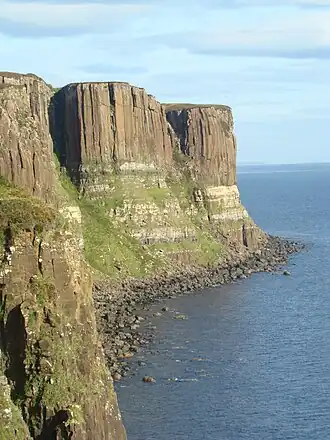 - π Kilt Rock is a sea cliff that looks not very much like a kilt, but the basalt columns are supposed to be the pleats and the dolerite sills the plaid pattern. It's viewed from the point where Loch Mealt flows out, with a waterfall cascading almost 200 feet over the cliff towards the sea.