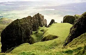 - π Quiraing: The east coast of Trotternish was formed by a huge landslip 10,000 years ago at the end of the last Ice Age. The ice had been supporting the mountainside, which collapsed leaving strange exposed rock formations. The Quirang takes its name from Old Norse KvΓ Rand, "round fold", for its little plateau hidden by rock pillars, a natural pen for concealing sheep. You only get a limited view from the road, so unless the weather's foul, take the four-mile loop walk to get close.