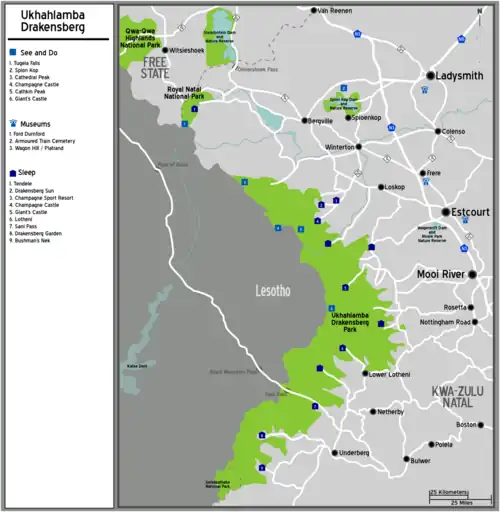 - Giant's Castle, ☏ +27 21 975-2189, fax: +27 21 975-5194, kznparks@toursa.com. Check-in: 2PM, check-out: 10AM. Operated by KwaZulu-Natal Parks and offers two- to six-bed chalets in the Giant's Castle Game Reserve