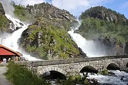 • 🌍 Låtefossen waterfall (Road 13 south from Odda). 24 h. The most popular of the waterfalls in the "valley of waterfalls". A 160-metre-high cascade fall. Road 13 crosses the flow on a fine old bridge and mist from the cascade keeps the road wet. Be considerate of the passing traffic. Free. OSM directions target=_blank