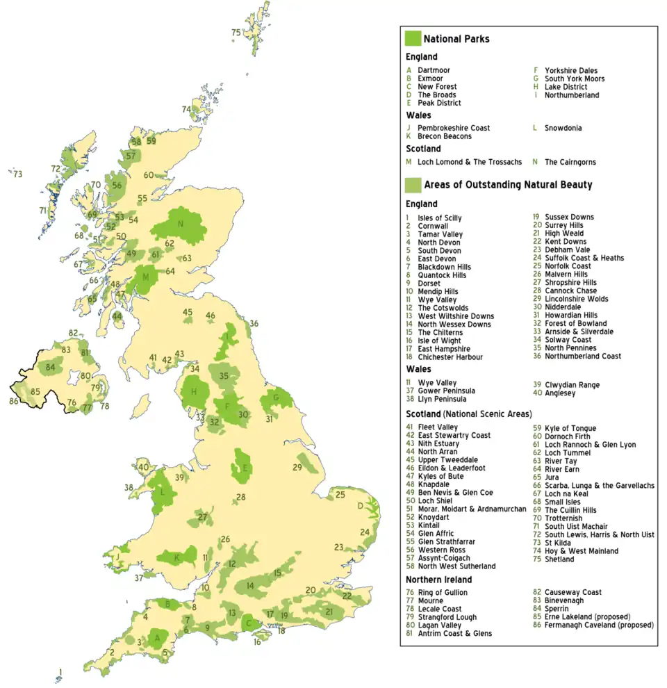 Lesser designations also exist: the National Landscapes of England and Wales, the Areas of Outstanding Natural Beauty of Northern Ireland, and the National Scenic Areas of Scotland.
