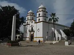 - 🌍 Parroquia San Miguel Arcángel, Av. Lafontaine 1, Centro. Clean and relatively austere colonial-style church with white stucco exterior flanked by twin bell towers with a central arch over the main entrance topped by a statue of St. Michael, swinging his sword.