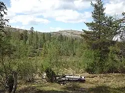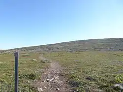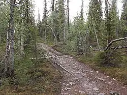 - 🌍 Ruijanpolku (turn from E75 to Sompiojärventie forest road at Vuotso, drive 14 km to the shore of Sompiojärvi, with camping area and other infrastructure – or start in Laanila/Kiilopää/Kakslauttanen). 35 km trail through Sompio to Kiilopää, Kakslauttanen or Laanila, part of the former trail between the Bothnian Bay and the coast of Finnmark (Finnish: Ruija) at the Arctic Ocean. It is mentioned as early as in the 16th century, but fell in disuse at the beginning of the 19th century. This section is now a marked hiking trail. Some of the historic markings (cairns, i.e. stone heaps) remain and must not be touched. The leg through Sompio is tough, with quite rough terrain. As camping is not allowed here, the 15 km (9.3 mi) leg between Sompiojärvi and the Kaptukaislampi lean-to shelter, with a 2×1.5 km sidetrip to the top of Terävä-Nattanen, has to be done in one day (there is a campfire site for a break before or after the sidetrip). Otherwise there are lean-to shelters 9–12 km (5.5–7.5 mi) apart. The trail crosses the road and some trails of the Kakslauttanen-Kiilopää area, allowing some variations in that end. Sompio is a strict nature reserve, leave no trace and keep to the trail.