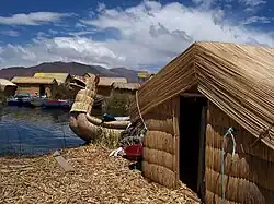 - Ride in a giant reed boat Most tours include a ride between islands in a huge, gaudy yellow, double-hulled reed "raft" (balsa) with twin puma heads at the bow. This part of the tour may or may not be mandatory, and as of 2025 may or may not cost an additional S/15-20 per person or solicit donations. These boats, though based on the smaller canoe-like, single-hull reed rafts used until the 1960s by the Uru people, are the modern invention of a local Uru man, inspired by Bolivian reed-boat expert Paulino Esteban, who designed similar boats for trans-oceanic expeditions by controversial Norwegian adventurer Thor Heyerdahl in the 1970s. The newest ones are filled with recycled plastic bottles and coated with a layer of fiberglass, in an attempt to make them last longer (the pure reed ones, becoming uncommon as of 2025, become waterlogged in less than a year and have to be discarded and replaced).