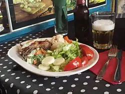 Uruguay has traditionally been a ranching country, with cattle outnumbering people more than two-to-one, and therefore features excellent (and affordable) steaks. One dish that should not be missed is chivito, a heart-attack-on-a-platter sandwich (some guidebooks call it a "cholesterol bomb") that is made of a combination of grilled tenderloin steak, tomato, lettuce, onion, eggs (hard-boiled and then sliced), ham, bacon, mozzarella cheese and mayonnaise and fries. There are two versions of chivito. Al pan means it's served "on bread", this is the classic variant and it looks like a hamburger served on a plate. If it is served al plato it is like a hamburger minus the bread and often with more vegetables.