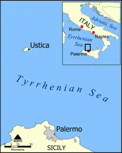 Ustica is a volcanic island in the Tyrrhenian Sea about 70 km north of the city of Palermo in Italy. The island's population is concentrated in a town of the same name.