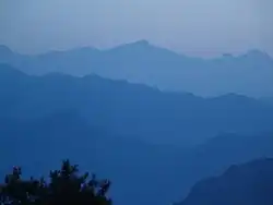 Pauri at dawn, Himalayas as the last upper ridge in the background