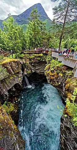- 🌍 Gudbrandsjuvet gorge, Road 63 (15 km from Valldal). All day, all year. The gorge and waterfall at Gudbrandsjuvet (15 kilometers upstream). The dry stone bridge across the gorge constructed in the 1920s as part of the Valldal-Åndalsnes road is still in use. The main river runs through a narrow (5 metres) and deep (25 metres) gorge, in fact a series of large "giant's kettle". The gorge is so narrow and complex that it is hard to see all even if the road runs across and there is an elaborate system of viewing platforms for visitors. Lovely rapids/waterfalls at Skjerdsura (boulders) just north of Gudbrandsjuvet along the road. According to the Sagas, king Olaf the Saint built the first road through the Skjerdsura boulders in year 1028. Free.