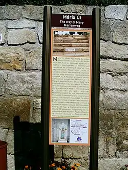 In addition to the traditional, colored signs for tourist, the Via Maria pilgrimage routes are marked by a special purple sign. Trails leading to sacred locations or to places where documents can be sealed/stamped have their own, additional trail marks. Road signs contain additional information at the junctions of the pilgrimage route, more important starting and destinations: these include directions, distance data and time information, as well as the name of the place. The Via Maria Public Benefit Association (Mária Út Közhasznú Egyesület) was founded on 2006.