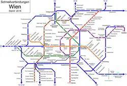 - 🌍 Vienna International Airport (Flughafen Wien-Schwechat VIE IATA) (just outside the city limits of Vienna on the far side of the City of Schwechat). To get to Vienna, you have three different railway options. The cheaper but slower S-Bahn line S7 (24 minutes; €4.60) and the more expensive but faster City Airport Train (15 minutes; from €11) both go to Wien-Mitte/Landstraße. If you are taking the S7 train, and you have a valid Vienna public transportation ticket, you only need to purchase a ticket from the Airport to Swechat, as all onward stations are covered by the zone 100 ticket. To Wien Hauptbahnhof (central station) and onwards, there are long distance trains leaving every 30 min (15 minutes; €4.20). There are also buses (Vienna Airport Lines) and taxis. For details on the airport transfer see the Vienna International Airport article.